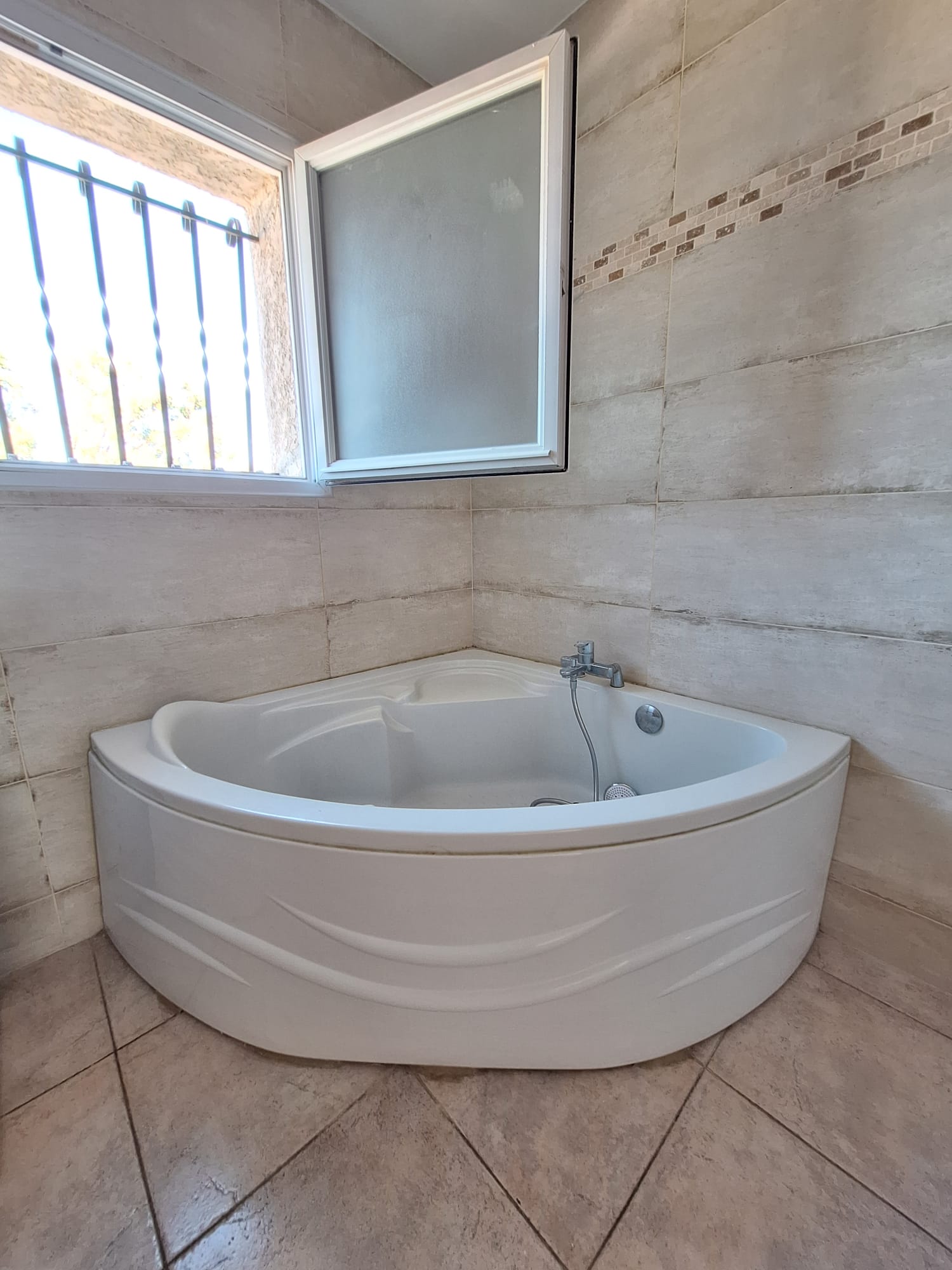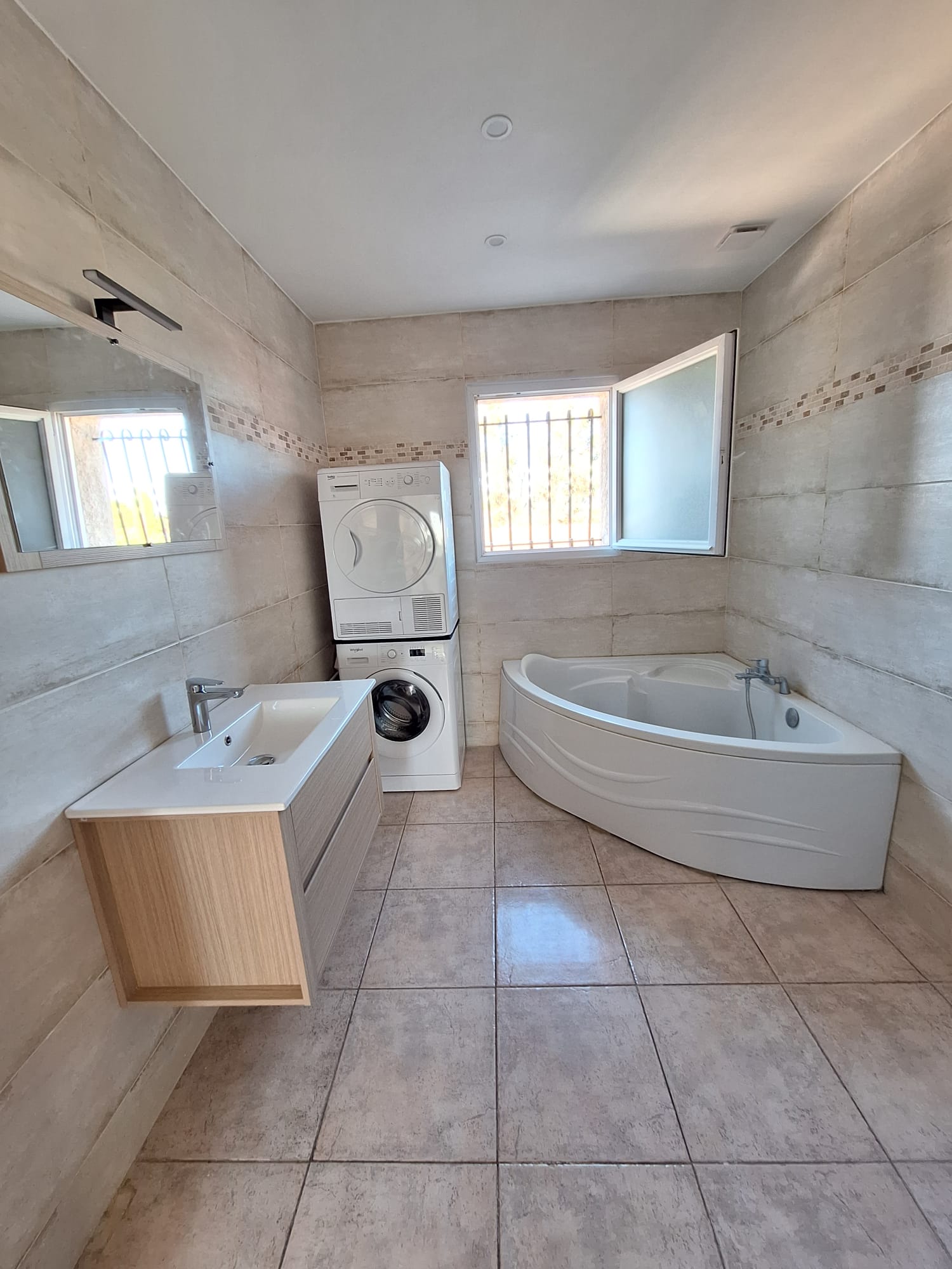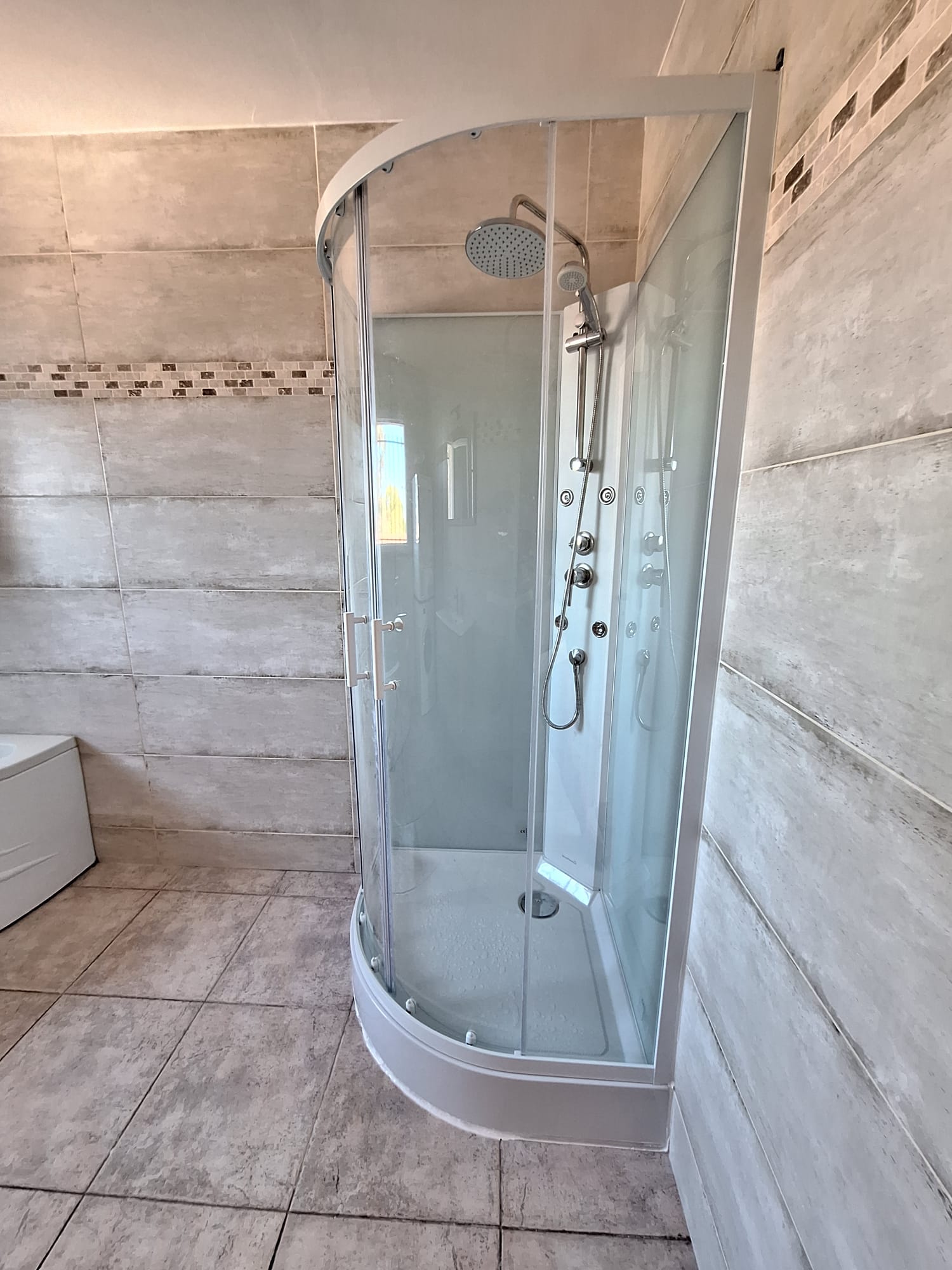 La salle de bain partagée est composée d’un meuble vasque, une douche et une baignoire.